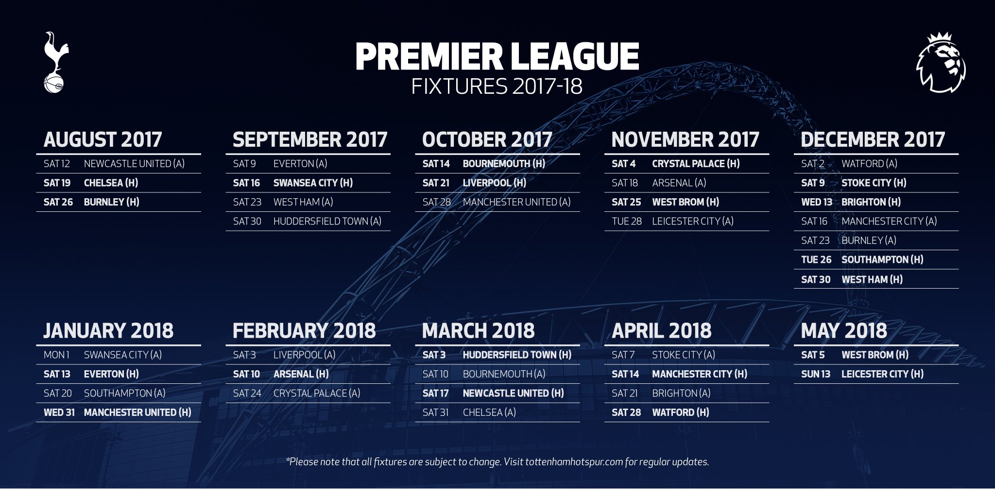Tottenham rozpocznie rozgrywki 12 sierpnia meczem z Newcastle United na St' James Park. Pierwszym meczem na Wembley będą derby Londynu z Chelsea w drugiej kolejce Premier League.